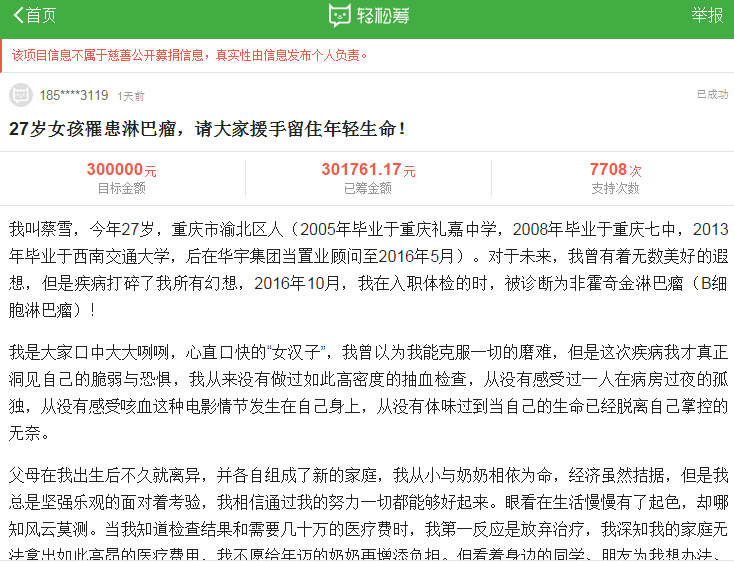 10月24日晚8:00,蔡雪校友患淋巴瘤的消息被发布出来。患难见真情!广大校友们知道了这个不幸的消息后,纷纷自发在全国各地校友微信群、QQ群等互动平台转发倡议,并积极为蔡雪捐款筹款,尽自己最大的力量,去帮助蔡雪战胜病痛,早日完成手术重拾健康。用了仅仅一个晚上,在次日早上9:00就成功筹款30余万元,解决了手术费的燃眉之急。有了这笔及时的善款,重庆蔡雪校友将在重庆第三军医大附属医院尽快接受治疗。