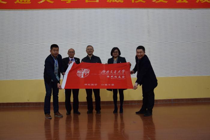张兵总会计师代表学校宣布西藏校友会正式成立,并向西藏校友会授旗,为第一届理事会成员代表颁发任职证书。随后,张兵总会计师从学校情况、校友工作现状和未来几年校友工作目标等几方面同校友们进行了交流。