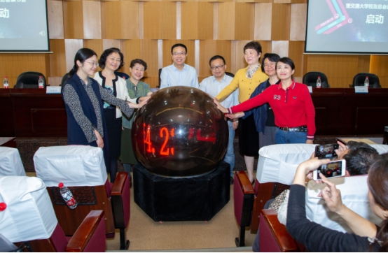 仪式最后,党委副书记、校长徐飞,副校长何川、朱健梅副校长,四川图工委主任党跃武,四川文旅厅公共文化服务处张茂副处长、中央民族大学民族学与社会学学院张亚莎教授、西安交通大学校友关系发展部白小萱主任、北京交通大学对外联络合作处郭雪萌处长、上海交通大学校友总会办公室黄缨同时按下启动球,
