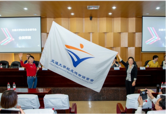 朱健梅副校长向交通大学校友总会读书会会长梁忆赠送会旗,一面飘扬的旗帜意味着沉甸甸的责任,历经百年的交大精神也在这旗帜间继续传承。