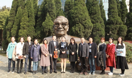 上午10:30,茅为蕙伫立在九里校区茅以升铜像前,静静聆听校园大使安静泽的讲解, “茅以升先生的这座铜像左肩比右肩宽,象征着铁肩担道义,右下角有八分之一球体上面有机车和轨道的浮雕,虚实结合,既充满着交大的特色,又像盛开的花,而铜像鼻尖指的方向所在正是学校的中轴线。”,随后,安静泽为茅为蕙清唱了校歌。在艺术团罗昊旻的小提琴伴奏下,茅为蕙向茅以升老先生铜像献花,并合影留念,表达了自己的缅怀之意。“感谢学校的心意,这是我见过的和爷爷本人最相像的塑像!”茅为蕙赞扬道。