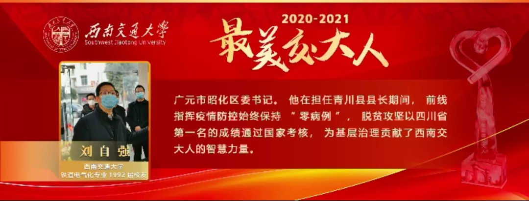 广元市昭化区委书记。他在担任青川县县长期间,前线指挥疫情防控始终保持“零病例”,脱贫攻坚以四川省第一名的成绩通过国家考核,为基层治理贡献了西南交大人的智慧力量。