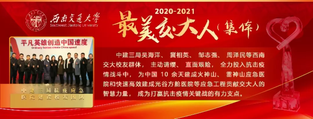 中建三局吴海洋、冀相英、邹志强、周泽民等西南交大校友群体,主动请缨、直面艰险,全力投入抗击疫情战斗中,为中国10余天建成火神山、雷神山应急医院和快速高效建成光谷方舱医院等应急工程贡献交大人的智慧力量,成为打赢抗击疫情关键战的有力支点。