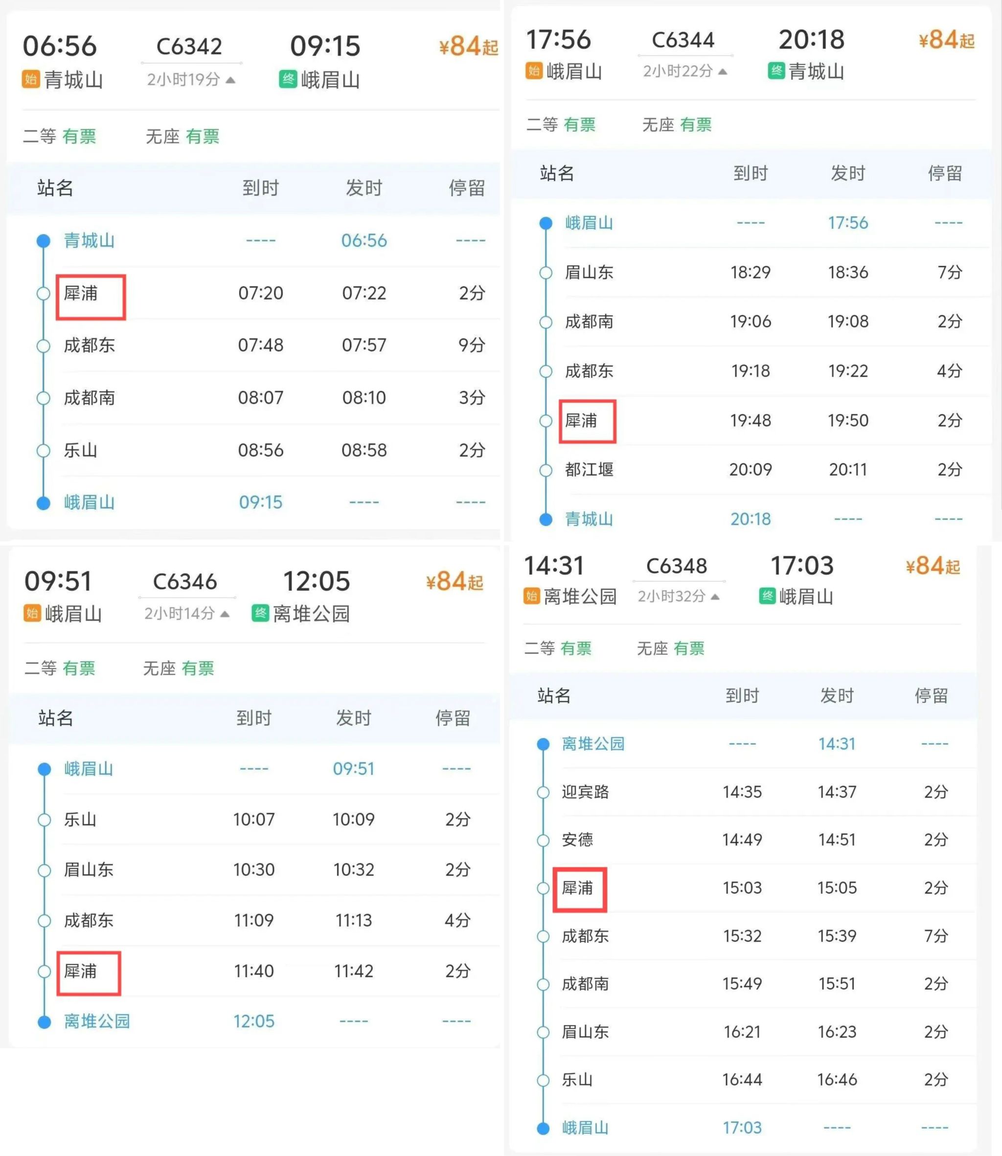 每日会有四班车往返于峨眉山与犀浦,青城山至峨眉山C6342次列车,由青城山站始发,7:20分经停犀浦站,9:15终到峨眉山站;峨眉山至青城山C6344次列车,17:56由峨眉山站始发,19:48经停犀浦站。