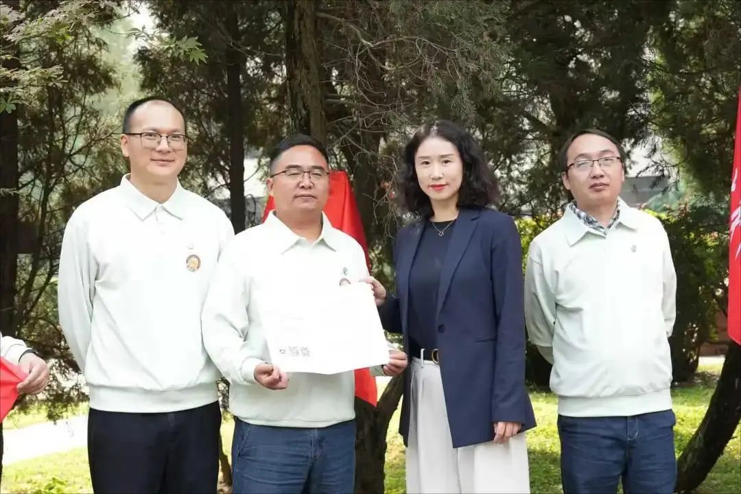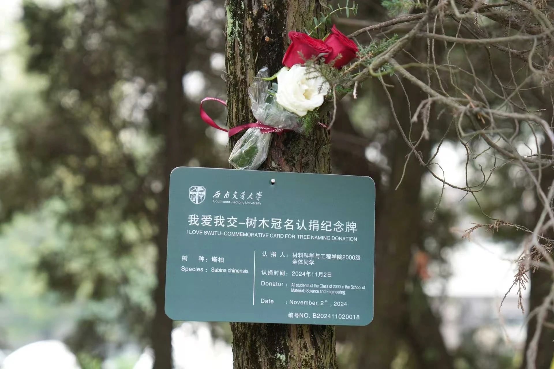 见面会后,校友们来到茅以升图书馆前,举行“我爱我交——树木冠名认捐”仪式。校友工作办公室副主任彭燕出席活动,她向返校的2000级校友表示热烈欢迎与诚挚问候。她指出,广大校友在社会各条战线建功立业,是交大精神的代际传承,是交大事业的实践延伸,是交大美誉的重要支撑。她衷心希望材料校友能与母校加强沟通联络,常回交大看看。随后彭燕和三个班的代表共同揭牌,并送上认捐证书。