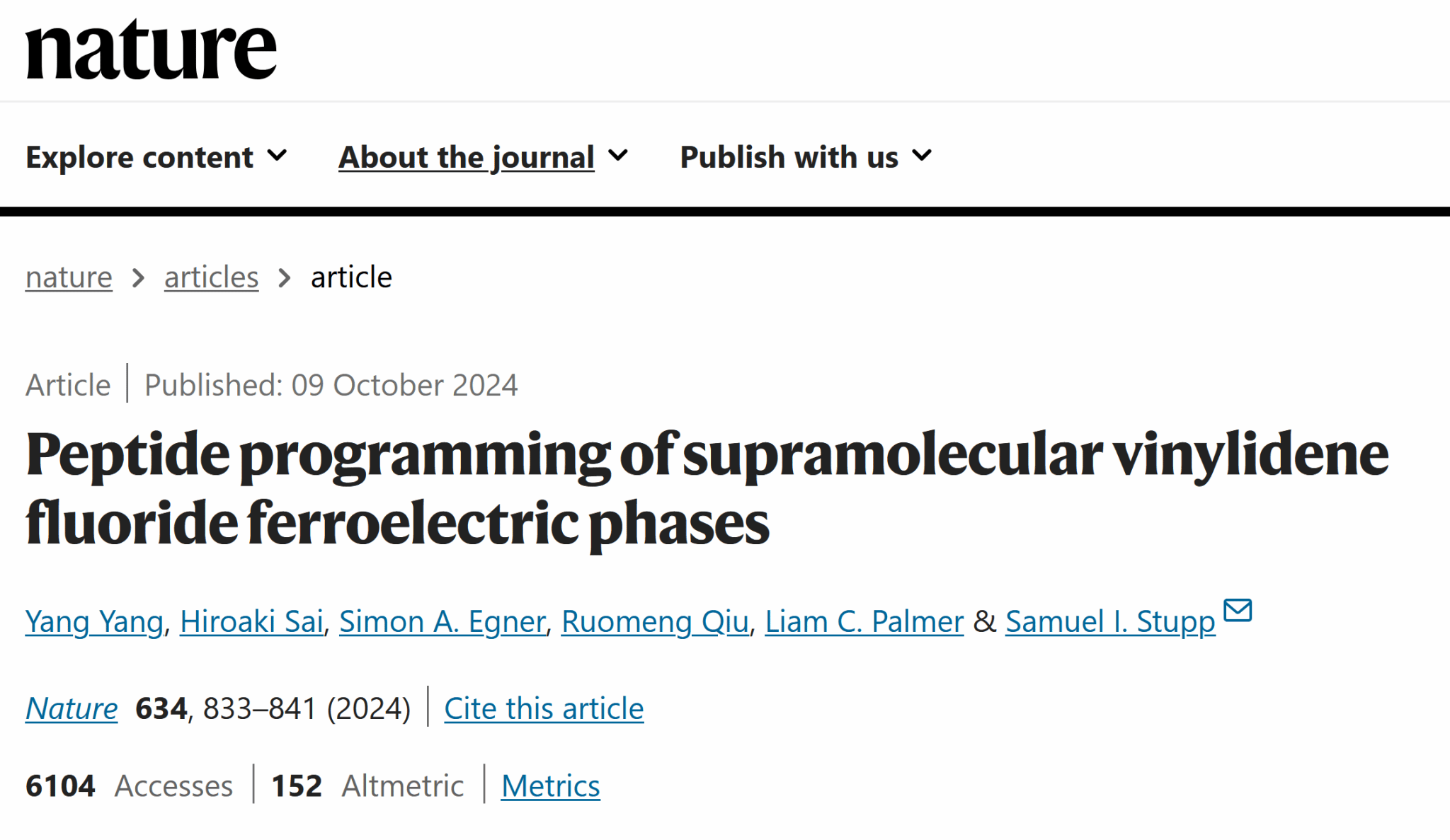 近期,国际著名学术期刊《自然》(Nature)正刊在线发表了电气工程学科、电工材料领域的最新研究成果。该成果的论文标题为:Peptide programming of supramolecular vinylidene fluoride ferroelectric phases,论文的第一作者杨洋博士为我校2010级电气工程学院(茅以升班)电气工程及其自动化专业本科毕业生。