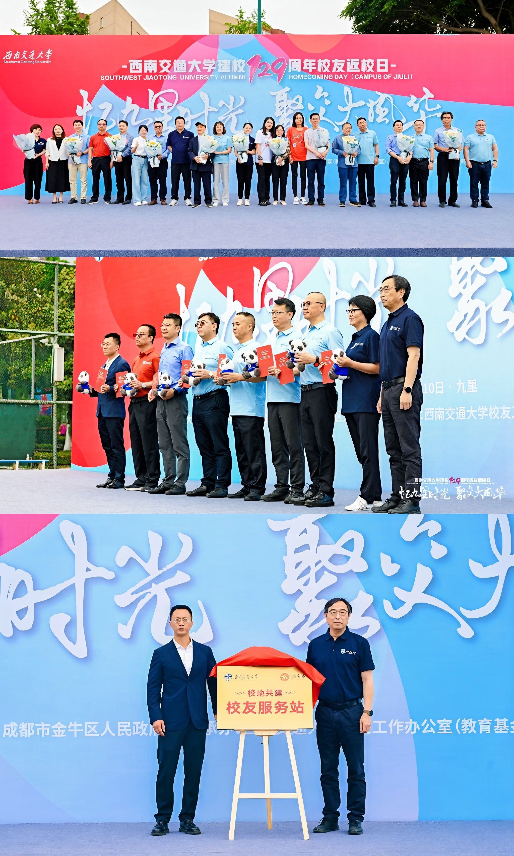 在“我爱我交”捐赠仪式上,1995届铁道工程、2004届人文社会科学、2005届信息管理与信息系统等专业校友通过树木冠名认捐的方式,支持母校的建设和发展,表达对母校深深的热爱。学校校友总会秘书长、教育基金会副理事长陈岩峰为捐赠专业代表颁发捐赠证书。金牛区科学技术局局长张正强和陈岩峰共同为“校地共建校友服务站”揭牌。服务站将为校友们提供更优质的资源和服务。