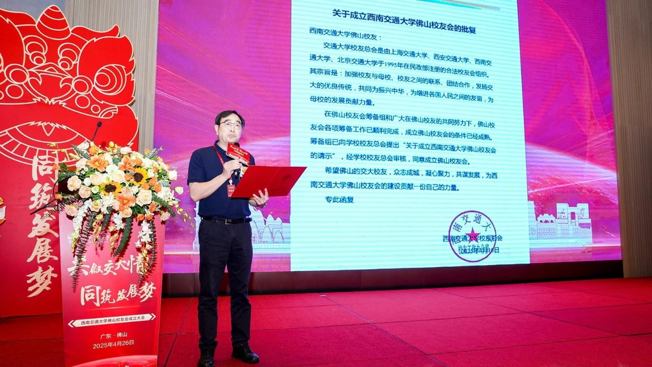 广东校友会会长傅新国代表广东校友会向佛山校友会的成立表示祝贺。他表示,佛山校友会的诞生,是交大人扎根南粤的根系延伸,更是“竢实扬华”精神在珠江之畔的薪火相传。他希望佛山校友会成为联结母校与湾区校友的桥梁,让“交大力量”在岭南大地绽放更璀璨光芒。