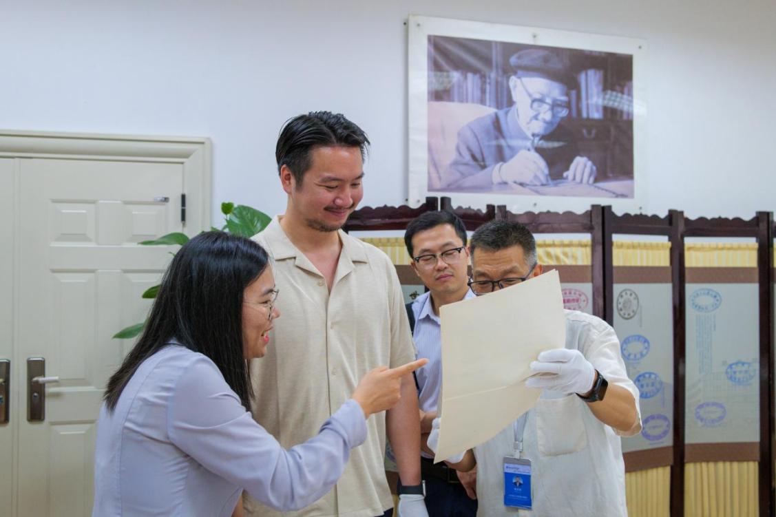 在图书馆,夫妇受到热情接待。在图书馆工作人员引导下,他们重点参观了馆内珍藏的林同炎先生求学时期的宝贵史料。在古籍特藏区,他们见到了林同炎先生当年在唐山交大求学时的毕业设计手稿原件,泛黄的纸张、工整的字迹,无声诉说着青年林同炎严谨治学的态度和在工程领域展现的非凡天赋。这些珍贵档案是我校“严谨治学、严格要求”双严传统的生动写照,也让夫妇二人得以近距离触摸祖父的青春岁月与学术起点。