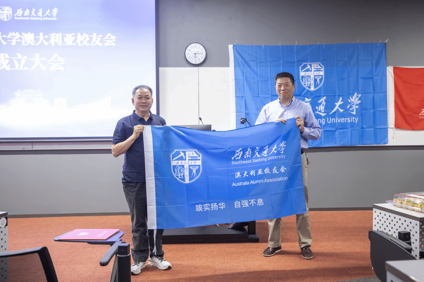 聘书颁发环节,校友工作办公室主任阮波、土木工程学院党委书记郑江、轨道交通运载系统全国重点实验室教授张卫华、人才工作办公室培育发展科科长段玉全为澳大利亚校友会第一届理事会成员颁发聘书。地球科学与工程学院教授朱庆代表母校向校友会授予会旗。