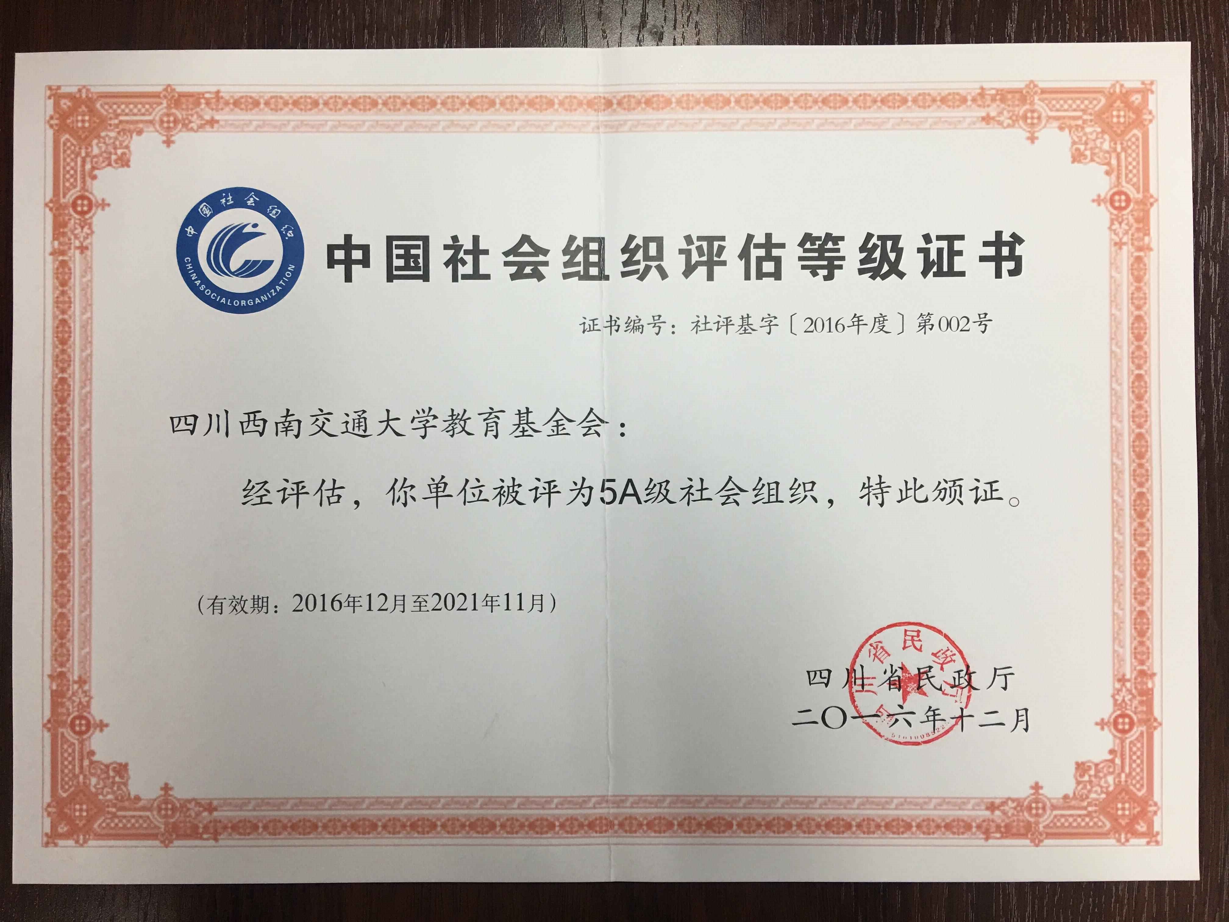 根据四川省民政厅于2017年1月11日公布的2016年度社会组织评估结果,西南交大教育基金会获评5A级社会组织,这是社会组织评估等级的最高级别。特向海内外广大校友们、师生们报喜。