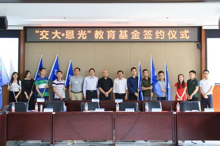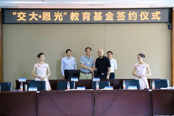 李治斌与高平平分别代表双方签订了“交大·恩光”教育基金捐赠协议。沈火明代表学校接受了李治斌的捐赠支票,并为其颁发捐赠证书。