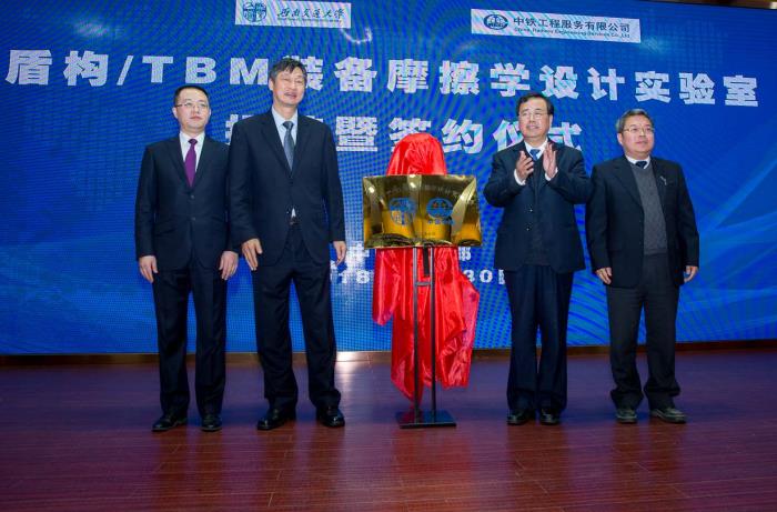 会议中,副校长周仲荣,中铁工程服务有限公司党委书记、执行董事苏叶茂为实验室签约。王顺洪书记、李建斌总经理共同为盾构/TBM装备摩擦学设计实验室揭牌。联合实验室将紧紧把握“中国制造2025”“大众创业,万众创新”“一带一路”等国家重大项目,将进一步促进盾构行业的快速发展。