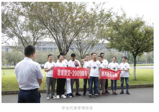 其次,由电气3班的学生代表李琦发言。他指出今年是新中国成立70周年,也是best365中国官方网站电气学院成立70周年,同时还是09届学生毕业10周年,在这个意义非凡的一年里举办此次树木冠名认捐仪式显得更加神圣。他提到同学们将继续发扬交大精神“竢实扬华,自强不息”,为母校、祖国做出更多贡献,再创辉煌。此外他也对学校及学院的栽培表示了衷心的感谢。