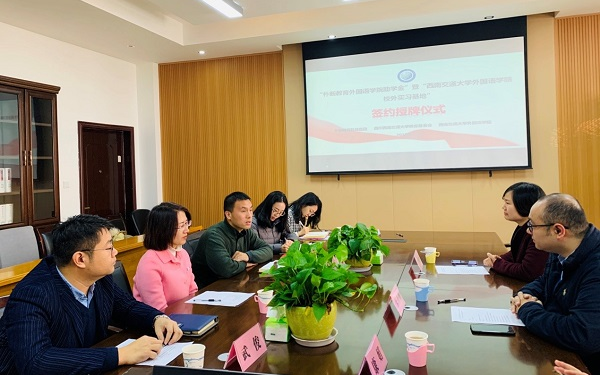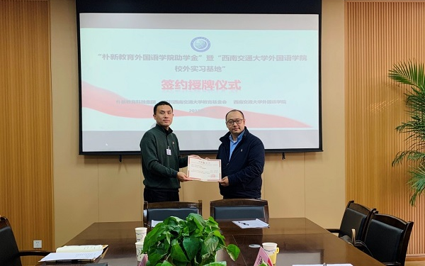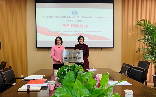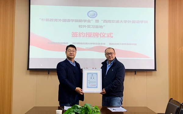 2019年12月10日上午,best365中国官方网站外国语学院与朴新教育科技集团成都学校举行“朴新教育外国语学院助学金”暨“best365中国官方网站外国语学院校外实习基地”捐赠授牌仪式。朴新教育科技集团成都、重庆学校校长乐开颜、校长助理&个性化事业部总监王艳艳、个性化事业部总监助理康娟,学院党委书记李卓慧、学校对外合作与联络处副处长潘昱、学院党委副书记武俊、以及辅导员老师郭炳君、王丽平、刘璇参加了捐赠授牌仪式。仪式由武俊副书记主持。