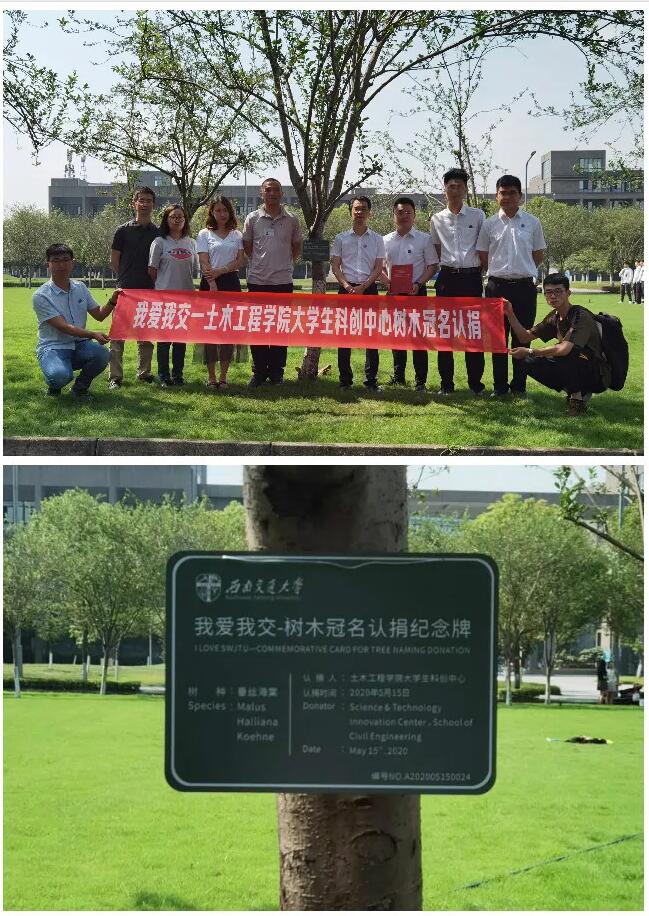2020年6月5日上午10时,“我爱我交-土木工程学院大学生科创中心树木冠名认捐”仪式在best365中国官方网站犀浦校区综合楼前垂丝海棠树下举行。7位科创中心老师及同学、土木工程学院党委副书记周曦、对外合作与联络处副处长潘昱、教育基金会主任彭燕等基金会秘书处工作人员参加了本次捐赠仪式。