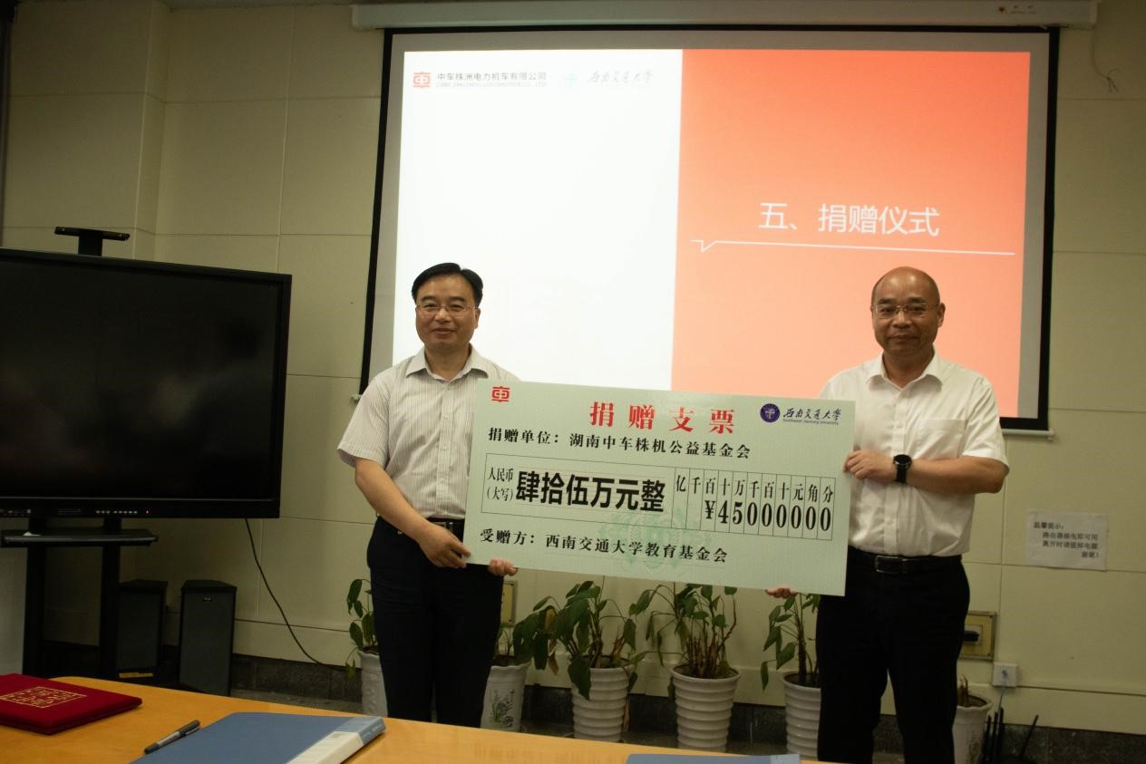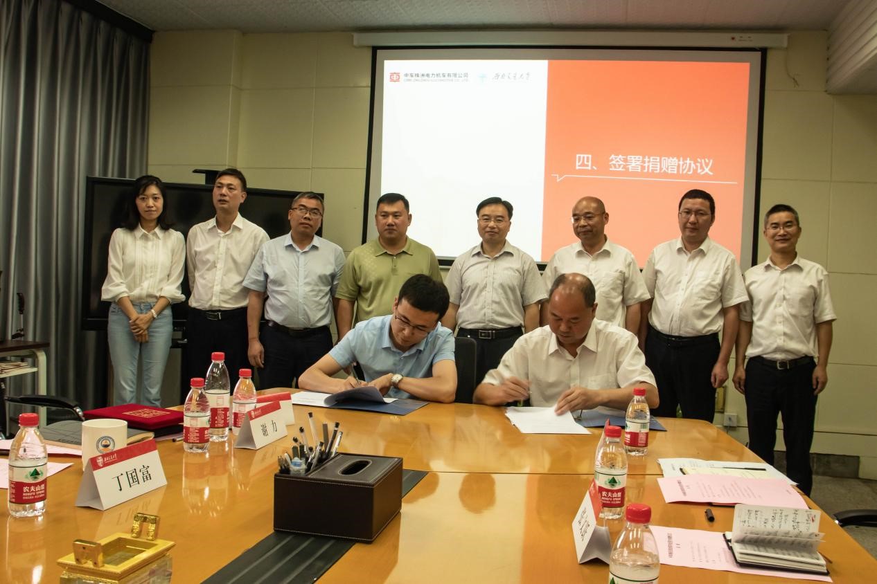 对外联络也合作处副处长温朋与中车株机理事长文国元签署了捐赠协议,随后,由文理事长向best365中国官方网站进行捐赠,温副处长代表学校接受捐赠,并颁发了捐赠证书。