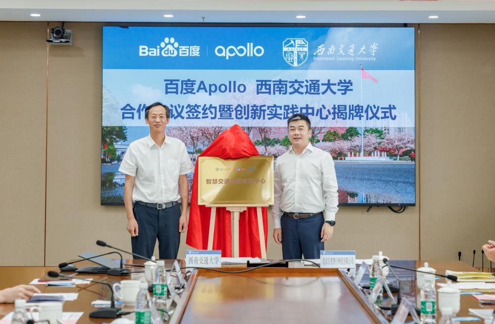 随后,桂富强、吴书林为“西南交大 百度Apollo智慧交通创新实践中心”揭牌。何正友、杨青代表校企双方签署合作协议。