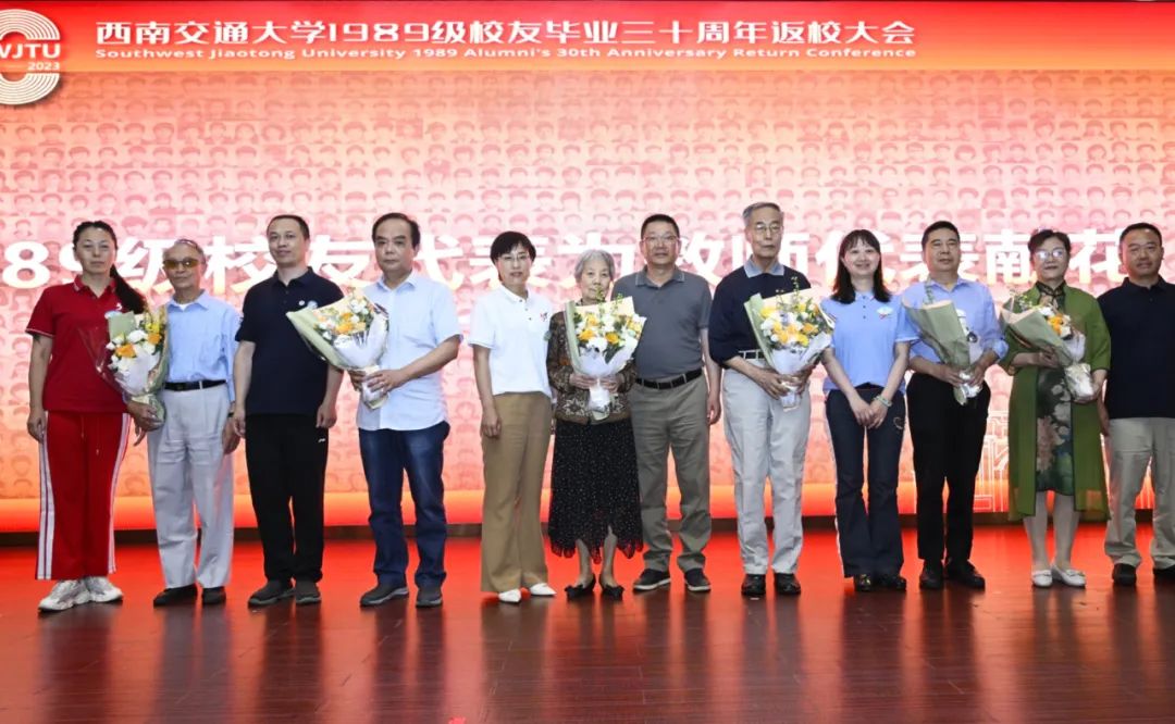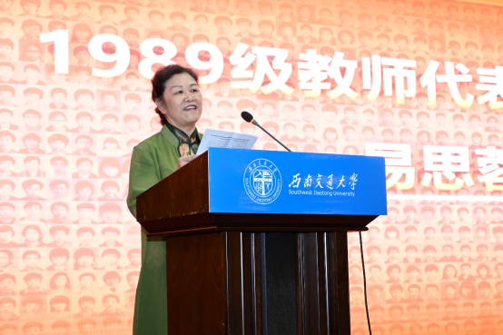 国家教学名师易思蓉老师作为89级教师代表发言。她说:“回忆起30年前与89级同学们告别时的场景,弹指一挥间,那时的青年学子如今已成为祖国建设的中心力量。虽然大学期间只有短暂的相处,但老师们始终视同学们为同行朋友,在设计,教学、科研等工作中共同服务于国家轨道交通事业。如今,89级的学子们在工作中做出了可喜的成绩,为国家的建设做出了很大的贡献,人生也得到了社会不同程度的认可,老师们以你们为荣!”
